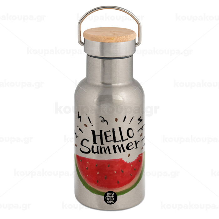 Summer Watermelon, Stainless steel metallic thermos flask, silver with a bamboo lid, double-walled, 350ml.