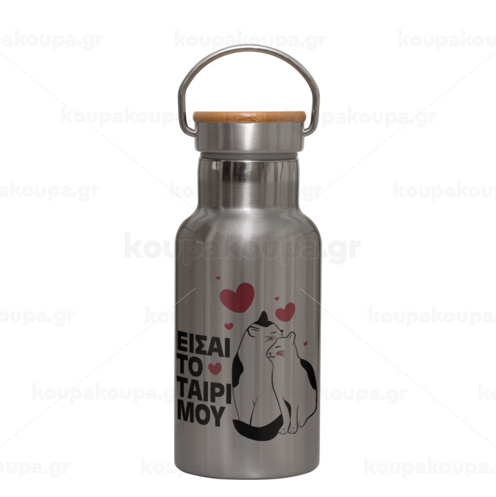 Είσαι το ταίρι μου, Stainless steel metallic thermos flask, silver with a bamboo lid, double-walled, 350ml.