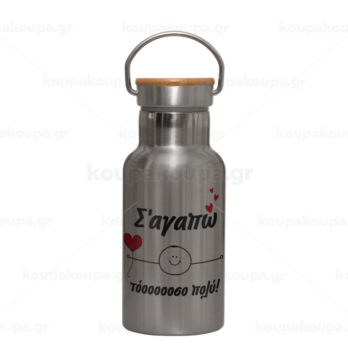 Σ΄αγαπώ τόοοοσο πολύ (Αγόρι)!!!, Stainless steel metallic thermos flask, silver with a bamboo lid, double-walled, 350ml.
