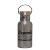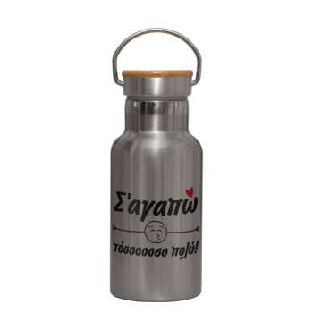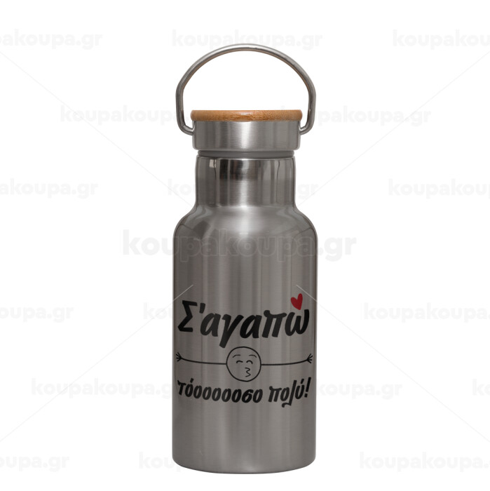 Σ΄ αγαπώ τόοοοοοσο πολύ!!!, Stainless steel metallic thermos flask, silver with a bamboo lid, double-walled, 350ml.