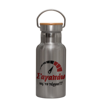 Σ΄ αγαπώ ως το τέρμα!!!, Stainless steel metallic thermos flask, silver with a bamboo lid, double-walled, 350ml.