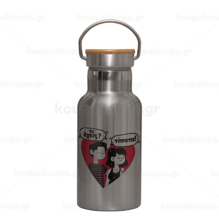 Τι έχεις? Τίποτα!, Stainless steel metallic thermos flask, silver with a bamboo lid, double-walled, 350ml.