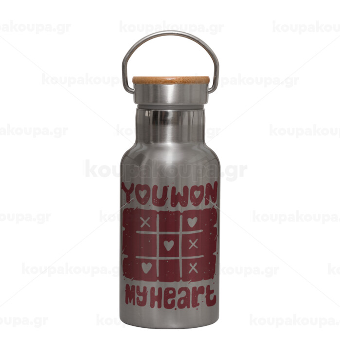 Τρίλιζα you won my heart, Stainless steel metallic thermos flask, silver with a bamboo lid, double-walled, 350ml.