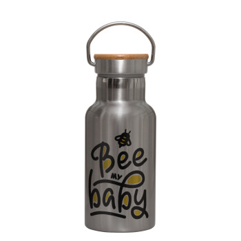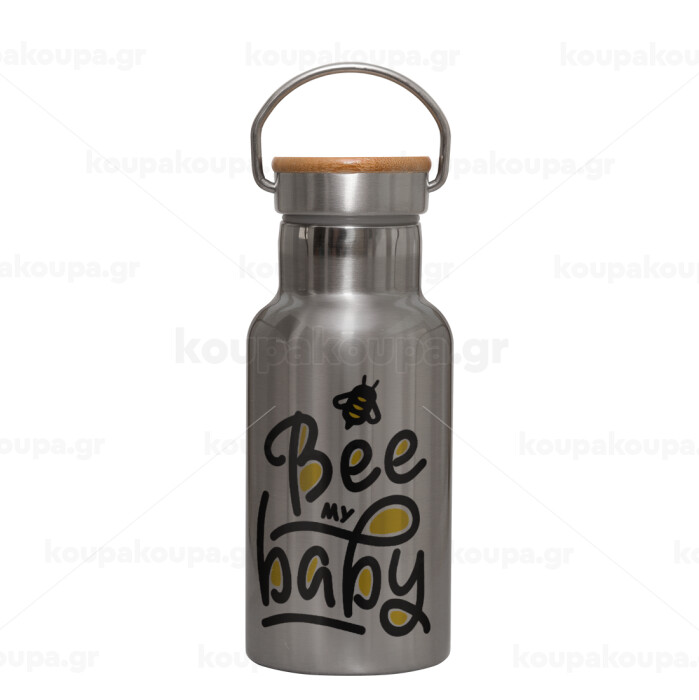 Bee my BABY!!!, Stainless steel metallic thermos flask, silver with a bamboo lid, double-walled, 350ml.