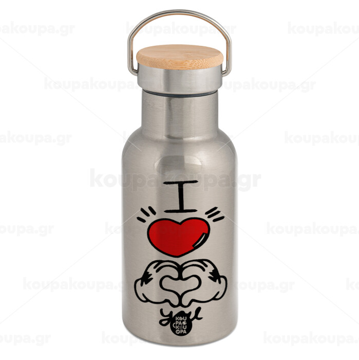 comics hands love, Stainless steel metallic thermos flask, silver with a bamboo lid, double-walled, 350ml.