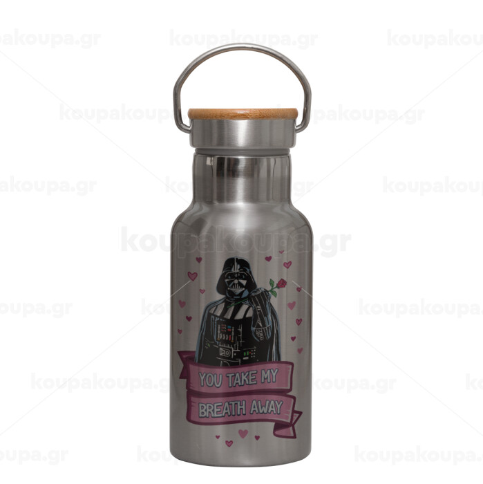 Darth Vader, you take my breath away, Stainless steel metallic thermos flask, silver with a bamboo lid, double-walled, 350ml.