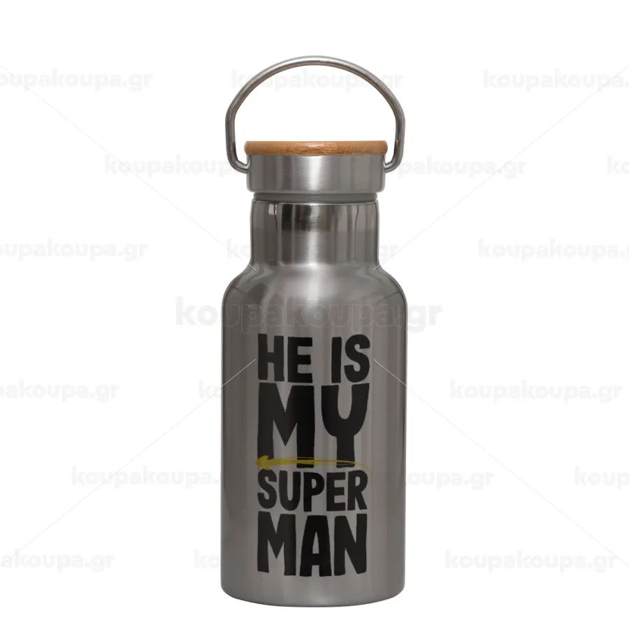 He is my superman, Stainless steel metallic thermos flask, silver with a bamboo lid, double-walled, 350ml.