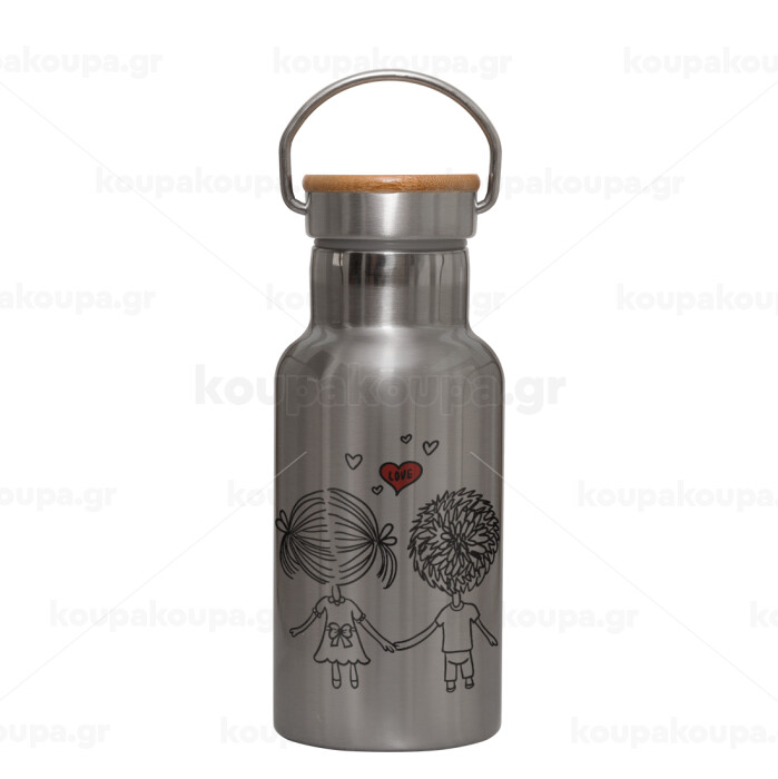 Hold my hand for ever, Stainless steel metallic thermos flask, silver with a bamboo lid, double-walled, 350ml.