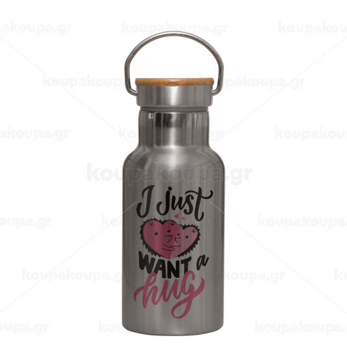 I Just want a hug!, Stainless steel metallic thermos flask, silver with a bamboo lid, double-walled, 350ml.