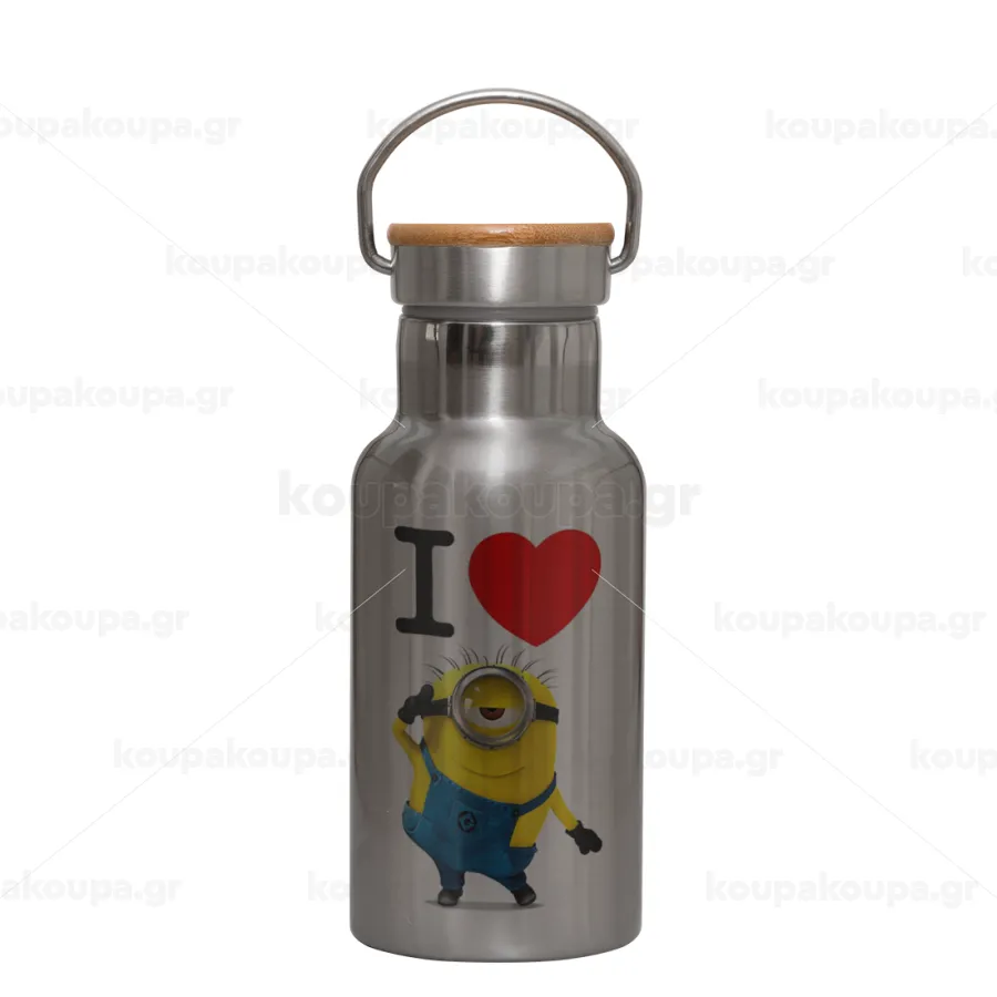 I love by minion, Stainless steel metallic thermos flask, silver with a bamboo lid, double-walled, 350ml.