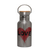 I Love You red heart, Stainless steel metallic thermos flask, silver with a bamboo lid, double-walled, 350ml.
