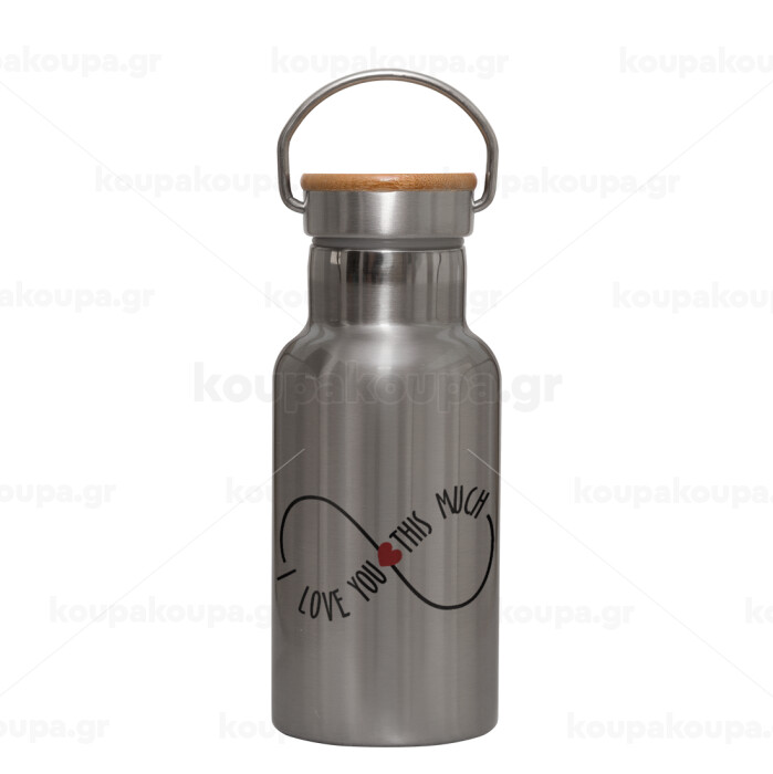 I Love you thisssss much (infinity), Stainless steel metallic thermos flask, silver with a bamboo lid, double-walled, 350ml.