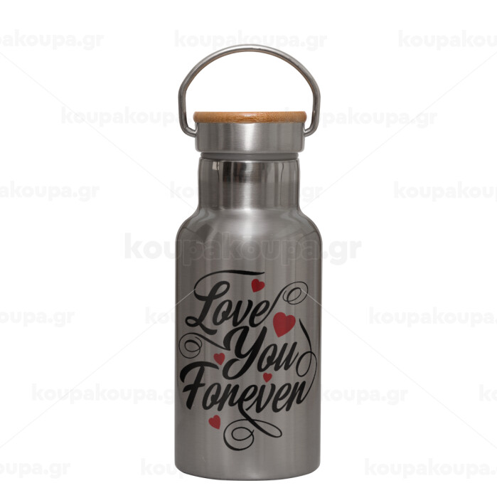 Love you forever, Stainless steel metallic thermos flask, silver with a bamboo lid, double-walled, 350ml.