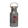 Mrs always right kiss, Stainless steel metallic thermos flask, silver with a bamboo lid, double-walled, 350ml.
