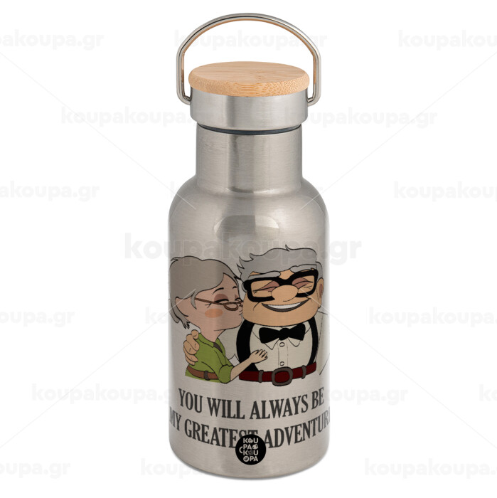 UP, YOU WILL ALWAYS BE MY GREATEST ADVENTURE, Stainless steel metallic thermos flask, silver with a bamboo lid, double-walled, 350ml.