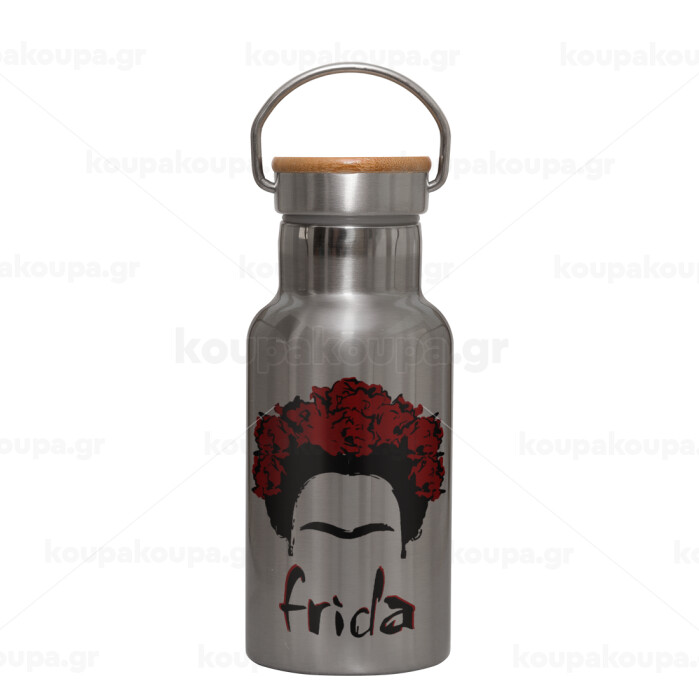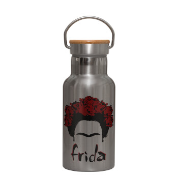 Frida, Stainless steel metallic thermos flask, silver with a bamboo lid, double-walled, 350ml.