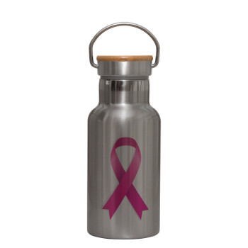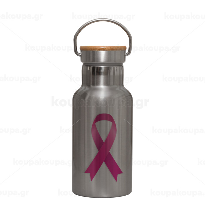 World cancer day, Stainless steel metallic thermos flask, silver with a bamboo lid, double-walled, 350ml.
