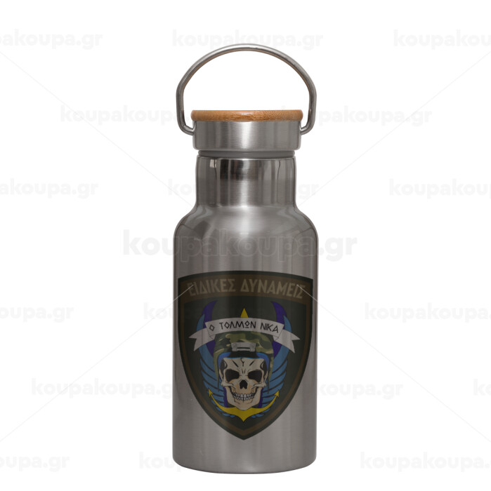 Hellas special force's, Stainless steel metallic thermos flask, silver with a bamboo lid, double-walled, 350ml.