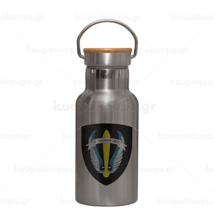 Έμβλημα Μονάδων Καταδρομών Ο Τολμων Νικα - Λοκ, Stainless steel metallic thermos flask, silver with a bamboo lid, double-walled, 350ml.