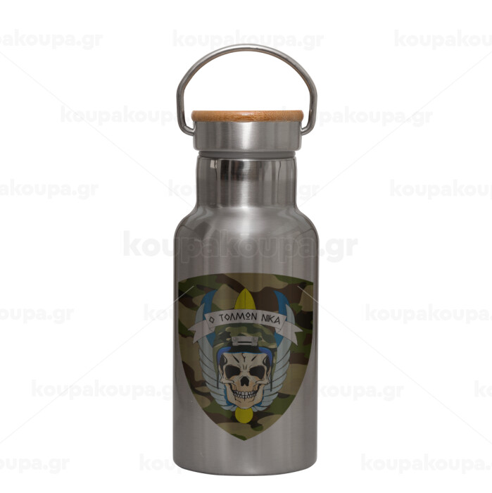 Special force, Stainless steel metallic thermos flask, silver with a bamboo lid, double-walled, 350ml.