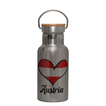 Austria flag, Stainless steel metallic thermos flask, silver with a bamboo lid, double-walled, 350ml.