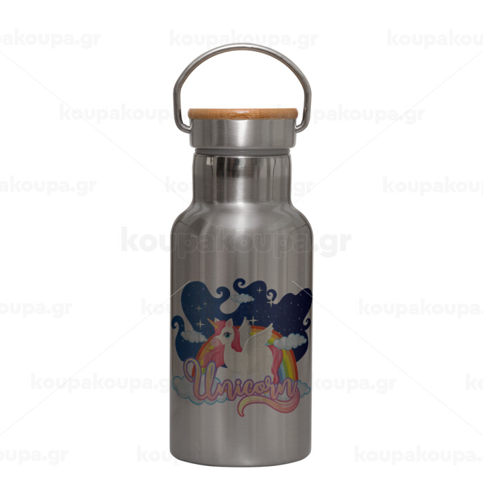 Μονόκερος, Stainless steel metallic thermos flask, silver with a bamboo lid, double-walled, 350ml.