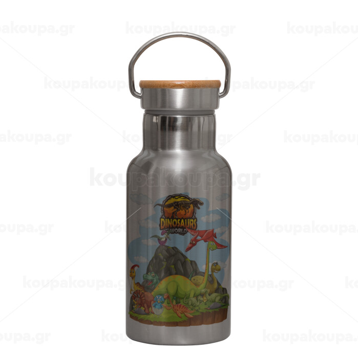 Dinosaur's world, Stainless steel metallic thermos flask, silver with a bamboo lid, double-walled, 350ml.