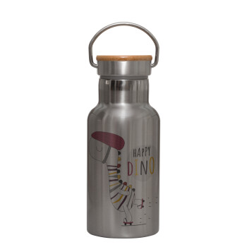 Happy Dino, Stainless steel metallic thermos flask, silver with a bamboo lid, double-walled, 350ml.