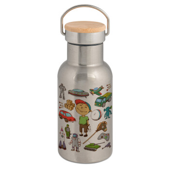 Toys Boy, Stainless steel metallic thermos flask, silver with a bamboo lid, double-walled, 350ml.
