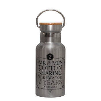 Mr & Mrs Sharing the sofa, Stainless steel metallic thermos flask, silver with a bamboo lid, double-walled, 350ml.