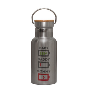 BABY, MOMMY, DADDY Low battery, Stainless steel metallic thermos flask, silver with a bamboo lid, double-walled, 350ml.