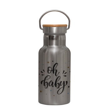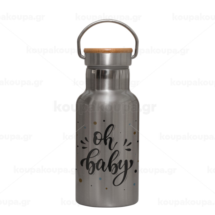Oh baby, Stainless steel metallic thermos flask, silver with a bamboo lid, double-walled, 350ml.