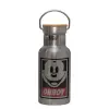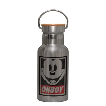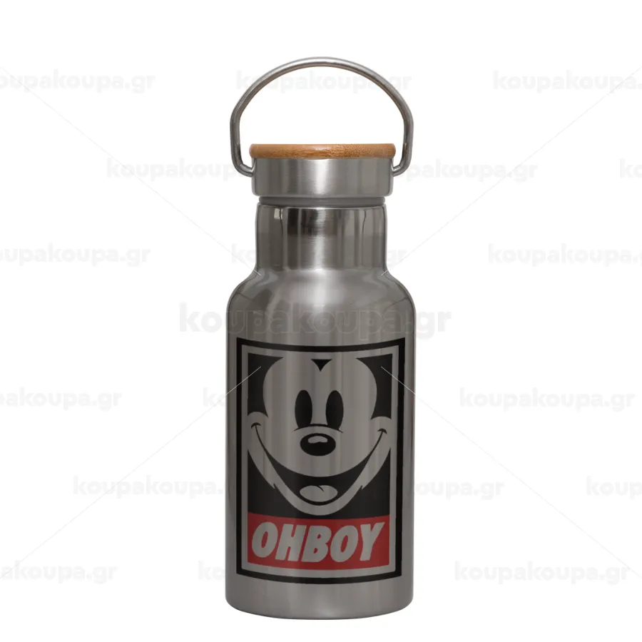 Oh boy μίκυ, Stainless steel metallic thermos flask, silver with a bamboo lid, double-walled, 350ml.