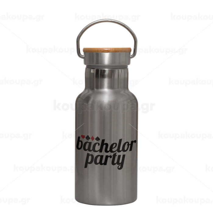Bachelor party, Stainless steel metallic thermos flask, silver with a bamboo lid, double-walled, 350ml.