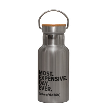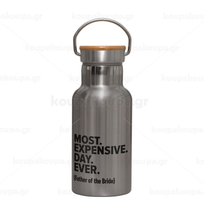 Most expensive day ever, Stainless steel metallic thermos flask, silver with a bamboo lid, double-walled, 350ml.