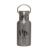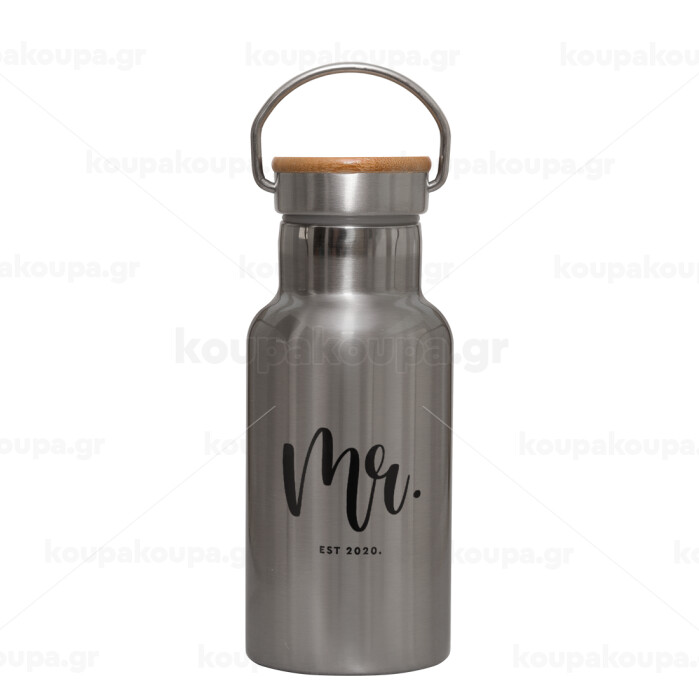 Mr & Mrs (Mr), Stainless steel metallic thermos flask, silver with a bamboo lid, double-walled, 350ml.
