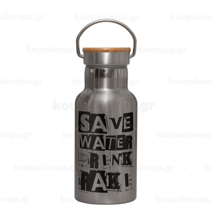 Save Water, Drink RAKI, Stainless steel metallic thermos flask, silver with a bamboo lid, double-walled, 350ml.