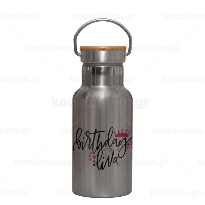 Birthday Diva queen, Stainless steel metallic thermos flask, silver with a bamboo lid, double-walled, 350ml.