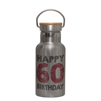 Happy 60 birthday!!!, Stainless steel metallic thermos flask, silver with a bamboo lid, double-walled, 350ml.