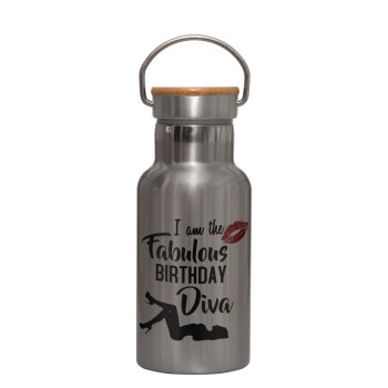 I am the fabulous Birthday Diva, Stainless steel metallic thermos flask, silver with a bamboo lid, double-walled, 350ml.