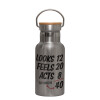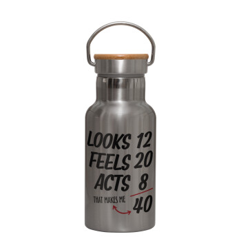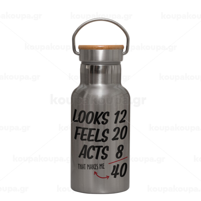 Looks, feels, acts LIKE your AGE, Stainless steel metallic thermos flask, silver with a bamboo lid, double-walled, 350ml.