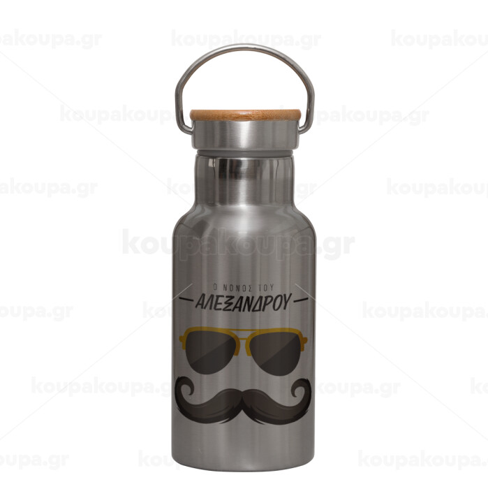 Ο νονός μου, μουστάκι με γυαλιά, Stainless steel metallic thermos flask, silver with a bamboo lid, double-walled, 350ml.
