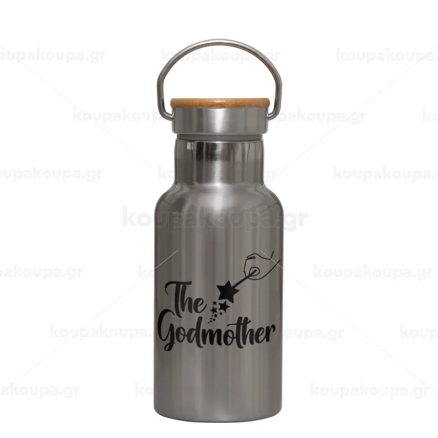 Fairy God Mother, Stainless steel metallic thermos flask, silver with a bamboo lid, double-walled, 350ml.