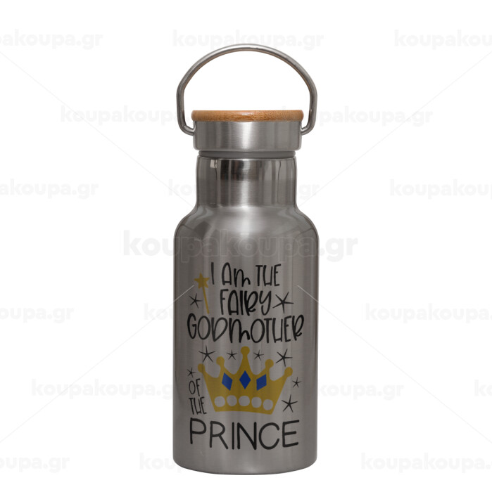 I am the fairy Godmother of the Prince, Stainless steel metallic thermos flask, silver with a bamboo lid, double-walled, 350ml.