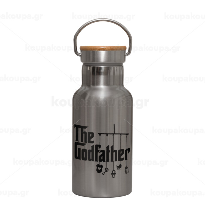 The Godfather baby, Stainless steel metallic thermos flask, silver with a bamboo lid, double-walled, 350ml.