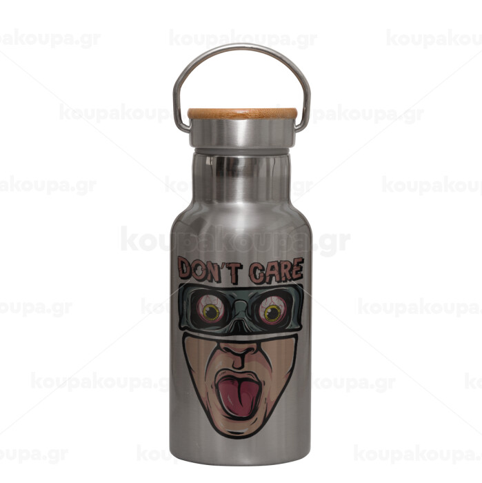 Don't Care, Stainless steel metallic thermos flask, silver with a bamboo lid, double-walled, 350ml.