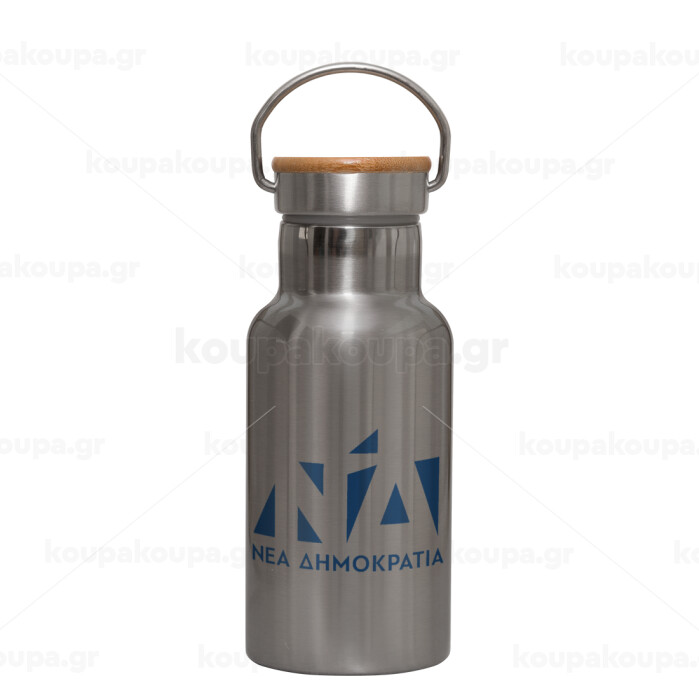 Νέα δημοκρατία, Stainless steel metallic thermos flask, silver with a bamboo lid, double-walled, 350ml.