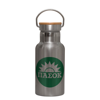 PASOK Green/White, Stainless steel metallic thermos flask, silver with a bamboo lid, double-walled, 350ml.