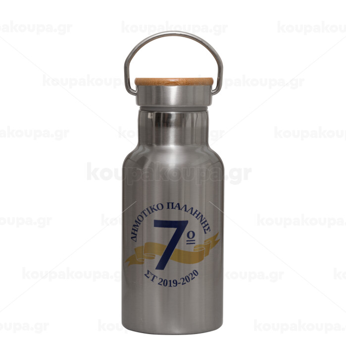 Σχολική μπλε με κορδέλα, Stainless steel metallic thermos flask, silver with a bamboo lid, double-walled, 350ml.