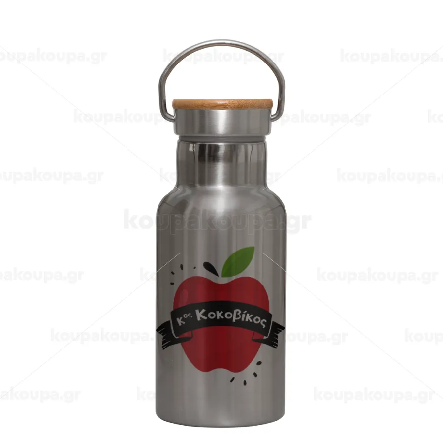 Αναμνηστικό Δώρο Δασκάλου Κόκκινο Μήλο, Stainless steel metallic thermos flask, silver with a bamboo lid, double-walled, 350ml.